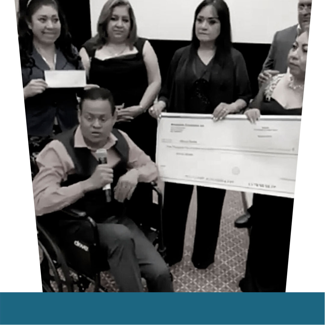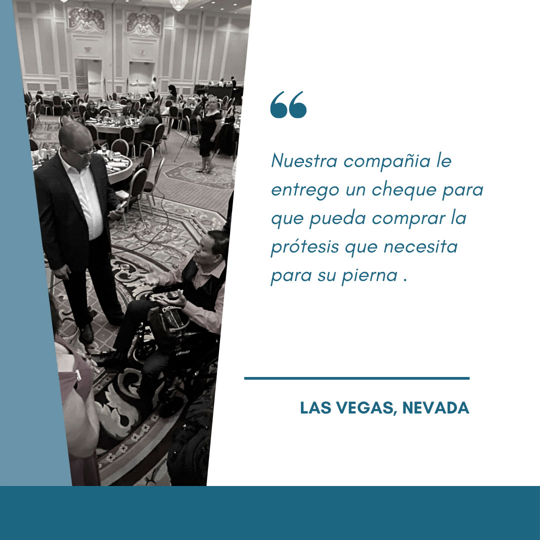 Nuestra compañia le entrego un cheque para que pueda comprar la prótesis que necesita para su pierna .