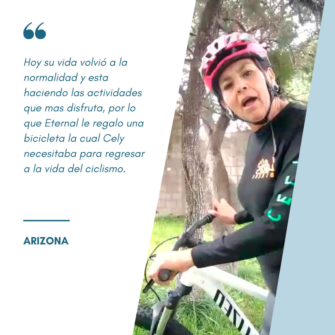 Hoy su vida volvió a la normalidad y esta haciendo las actividades que mas disfruta, por lo que Eternal le regalo una bicicleta la cual Cely necesitaba para regresar a la vida del ciclismo.