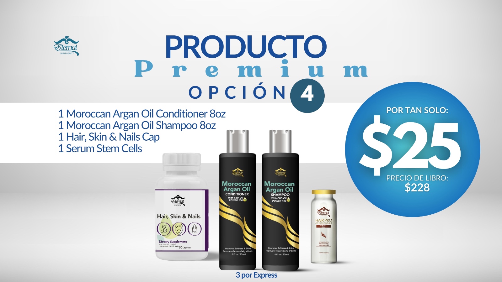 Incluye: 1 ETERNAL MOROCCAN ARGAN OIL CONDITIONER 8 OZ + 1 ETERNAL MOROCCAN ARGAN OIL SHAMPOO 8 OZ + 1 Hair, Skin & Nails Caps + 1 Serum Stem Cells